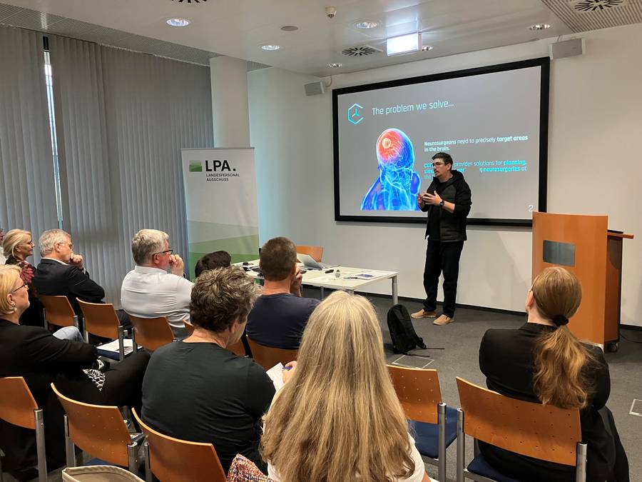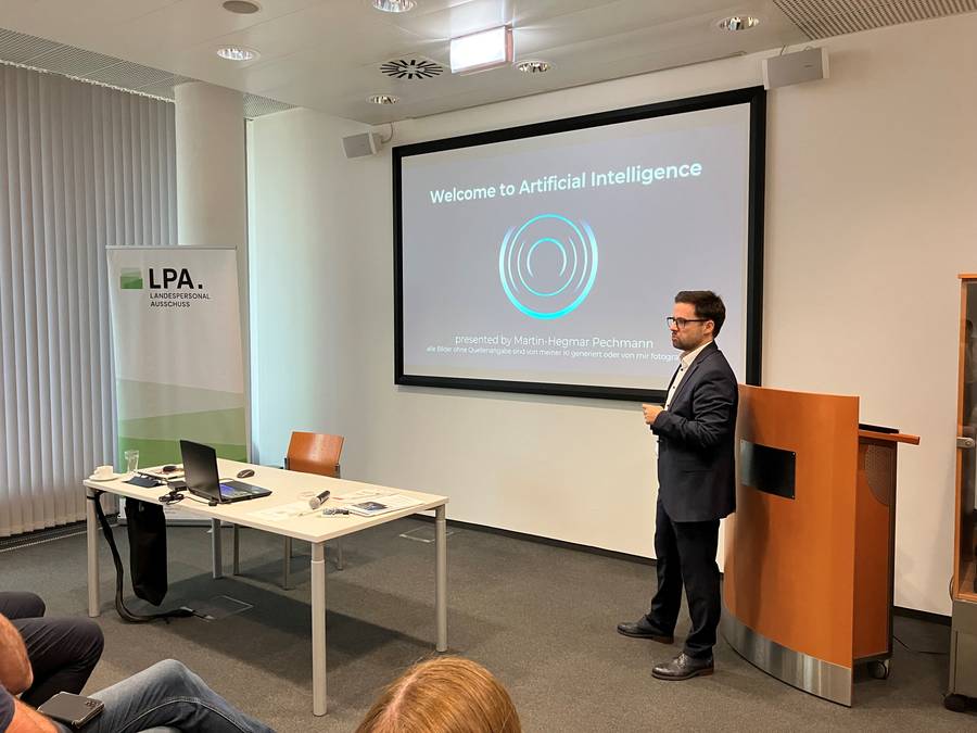Neben der Vorstellung der innovativen Startups bot das Symposium auch einen spannenden Fachvortrag von Hegmar Pechmann vom LPA. In seinem Vortrag ging er auf die praktischen Möglichkeiten ein, wie Künstliche Intelligenz die tägliche Arbeit der Personalvertreter unterstützen kann. Er zeichnete ein klares Bild davon, wie moderne Technologien bereits heute in den Arbeitsalltag integriert werden und wohin die Reise in Zukunft gehen könnte.