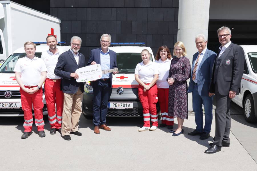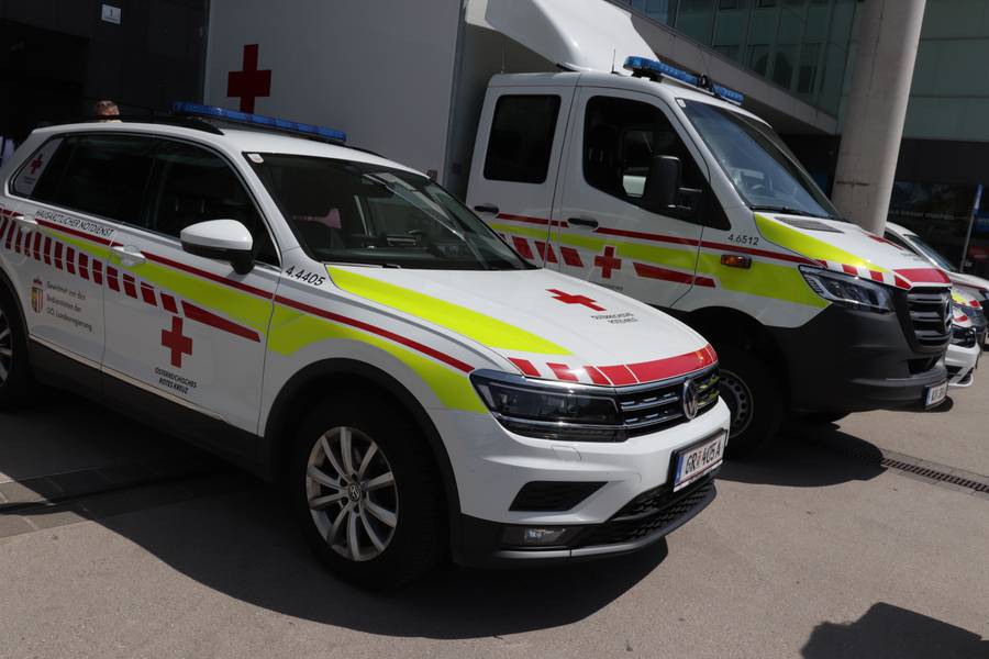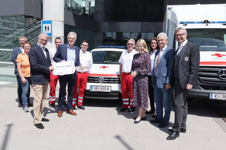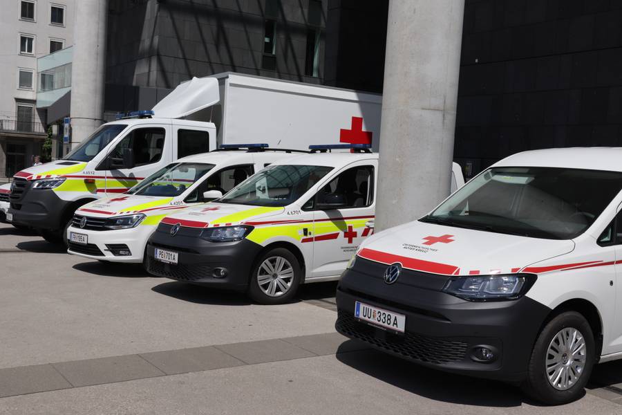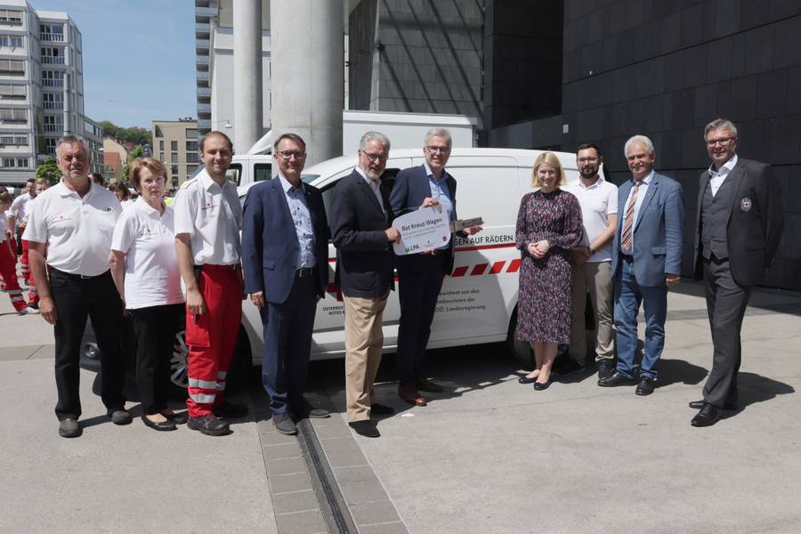 Im Zuge des Gesundheitstages der Oö. Landesbediensteten stand am Mittwoch, 11. Mai 2022, vor dem Landesdienstleistungszentrum in Linz die Übergabe von fünf Rot Kreuz Wägen an das OÖ. Rote Kreuz auf dem Programm. Der Präsident des OÖ. Roten Kreuzes Dr. Walter Aichinger und Landesgeschäftsleiter-Stv. Dir. Mag. Thomas Märzinger nahmen den symbolischen Schlüssel entgegen.